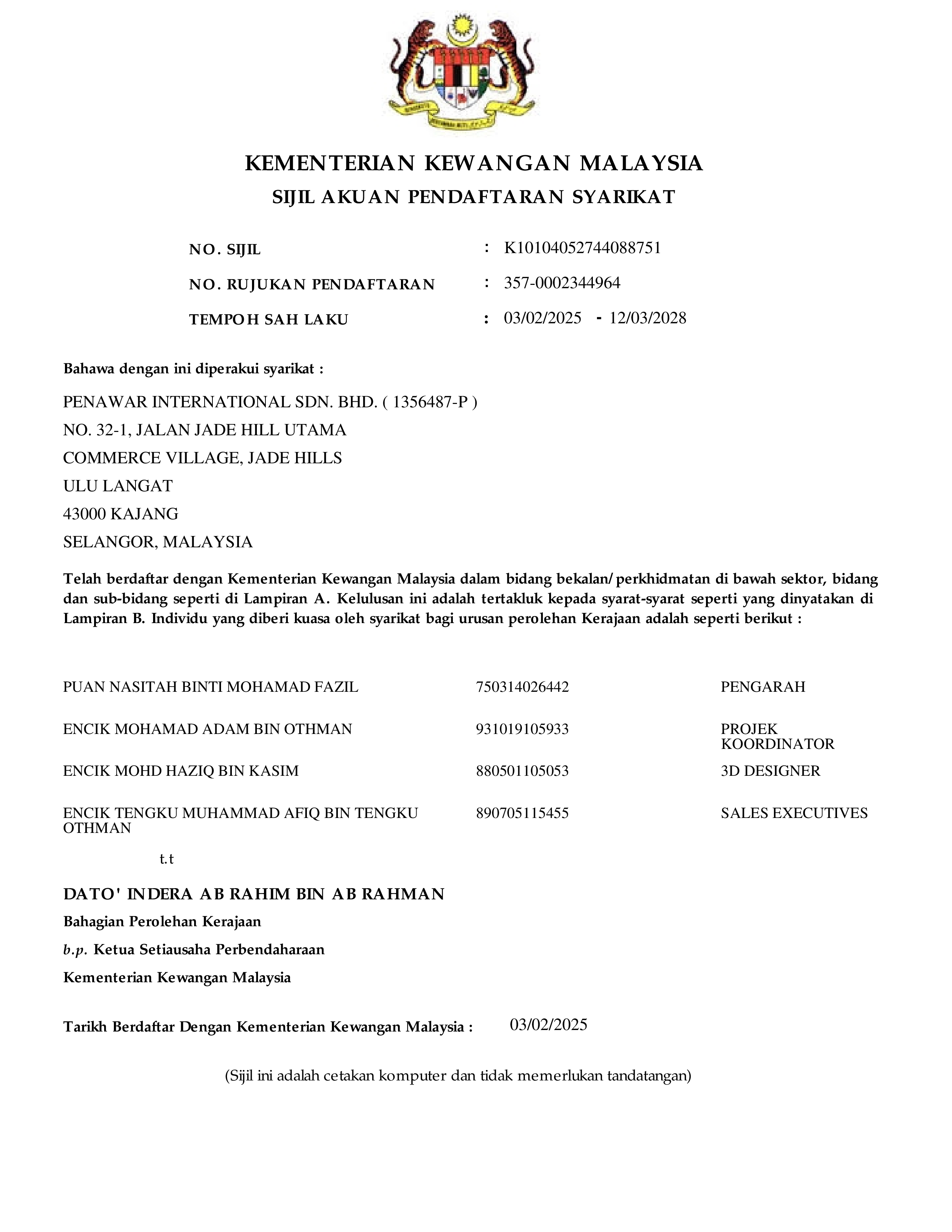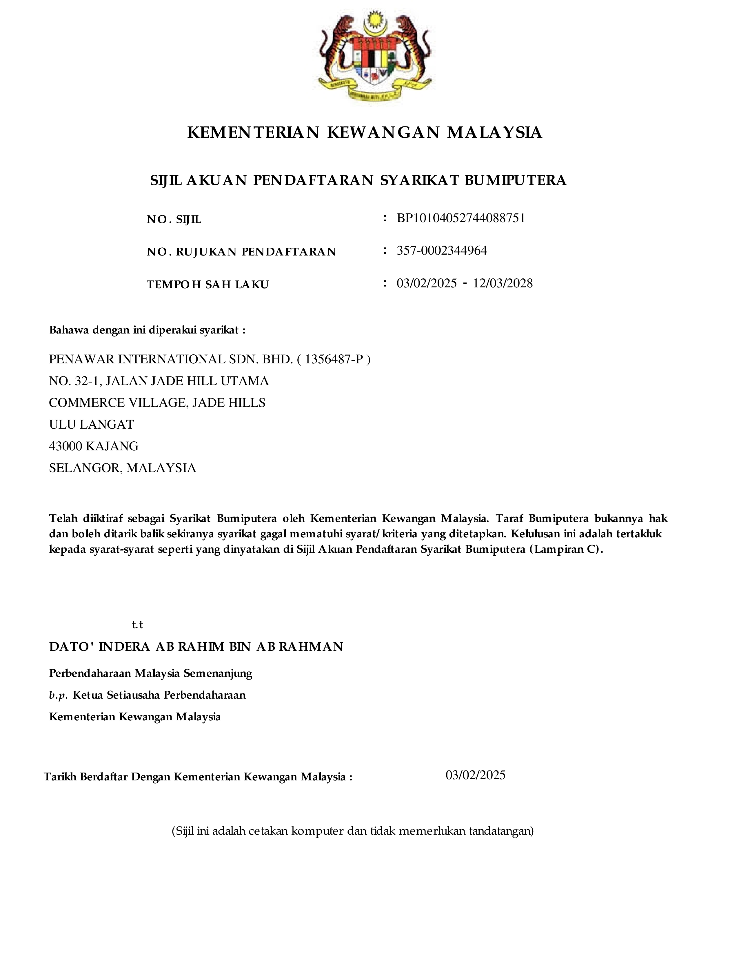 Established in January 2020, Penawar International Sdn. Bhd. (SSM Registration No. 135647-P) is a 100% Bumiputera-owned company, based in Selangor, Malaysia. With an authorized capital of RM750,000—scalable to accommodate the needs of government and commercial projects—we are committed to delivering excellence across our diverse portfolio. Our expertise spans exhibition and event management, as well as gallery, museum, and interior design, ensuring innovative and high-quality solutions tailored to our clients' needs.